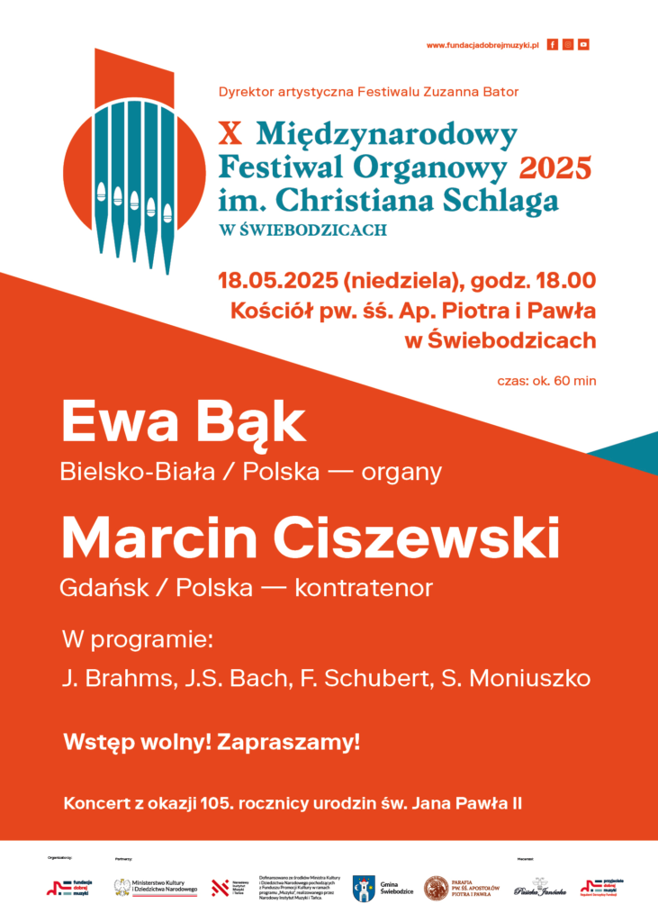 18 maja 2025 roku, w niedzielę, o godz. 18.00 w Kościele śś. Apostołów Piotra i Pawła w Świebodzicach odbędzie się prolog X Międzynarodowego Festiwalu Organowego im. Christiana Schlaga. W godzinnym koncercie wystąpią znakomici artyści: Ewa Bąk- organistka z Bielska-Białej oraz Marcin Ciszewski- kontratenor z Gdańska. Wstęp jest wolny, serdecznie zapraszamy!