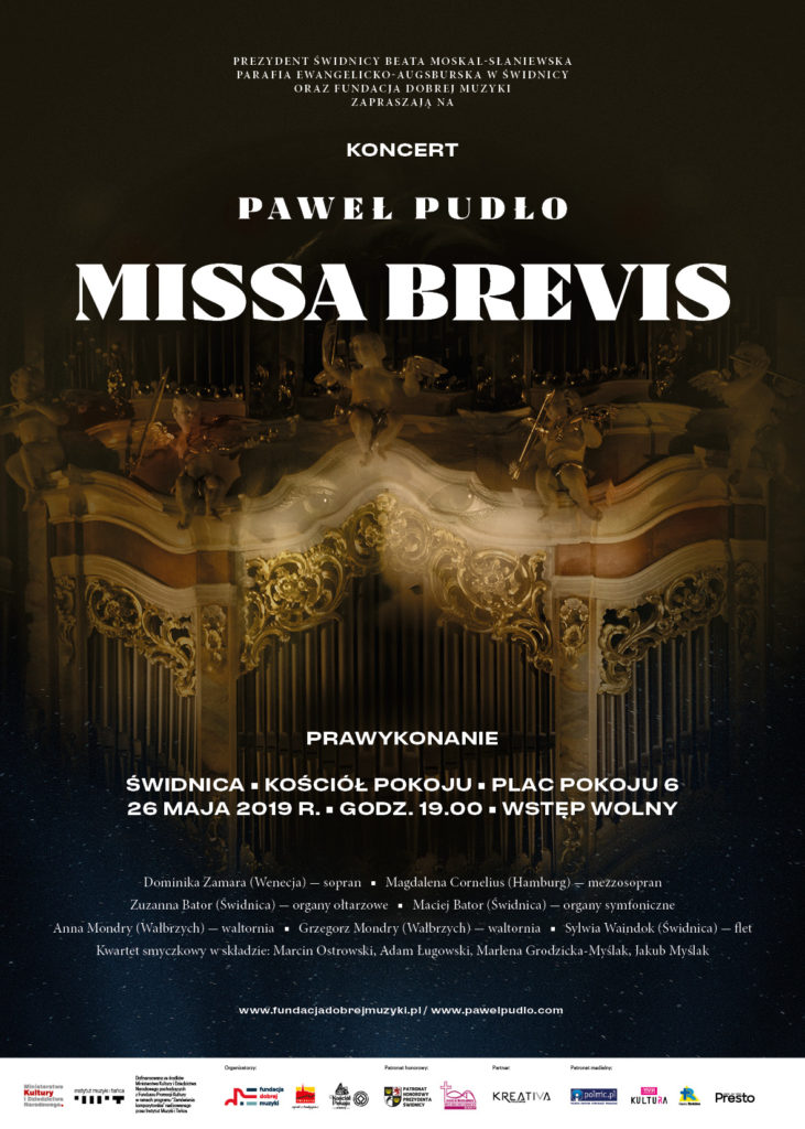 26 maja 2019 roku w Kościele Pokoju w Świdnicy odbędzie się prapremiera kompozycji Pawła Pudło „Missa Brevis” na sopran, mezzosopran, dwoje organów, kwartet smyczkowy, dwie waltornie i flet.