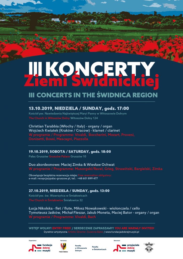 Cykl "III Koncerty Ziemi Świdnickiej" będzie składał się z 3 kameralnych koncertów wykonywanych w wiejskich kościołach oraz w pałacu znajdujących się w okolicach Świdnicy. Przedsięwzięcie powstało z chęci przyjścia z muzyką klasyczną do przestrzeni najbliższych Słuchaczom - czyli do ich miejsc zamieszkania.